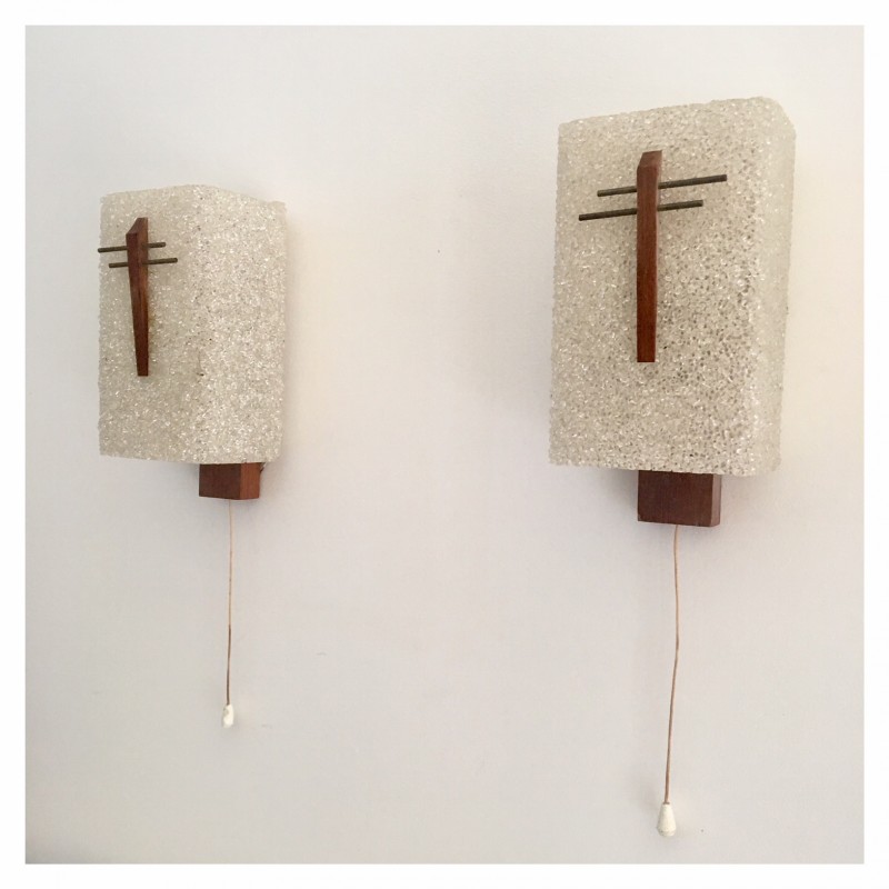 Paire d'appliques Teck et pastique granité qui donne à la luminosité, un très beau rendu.