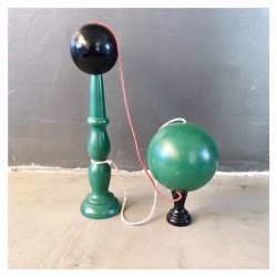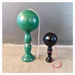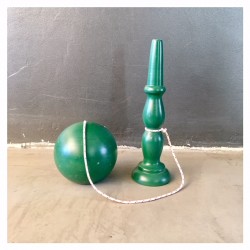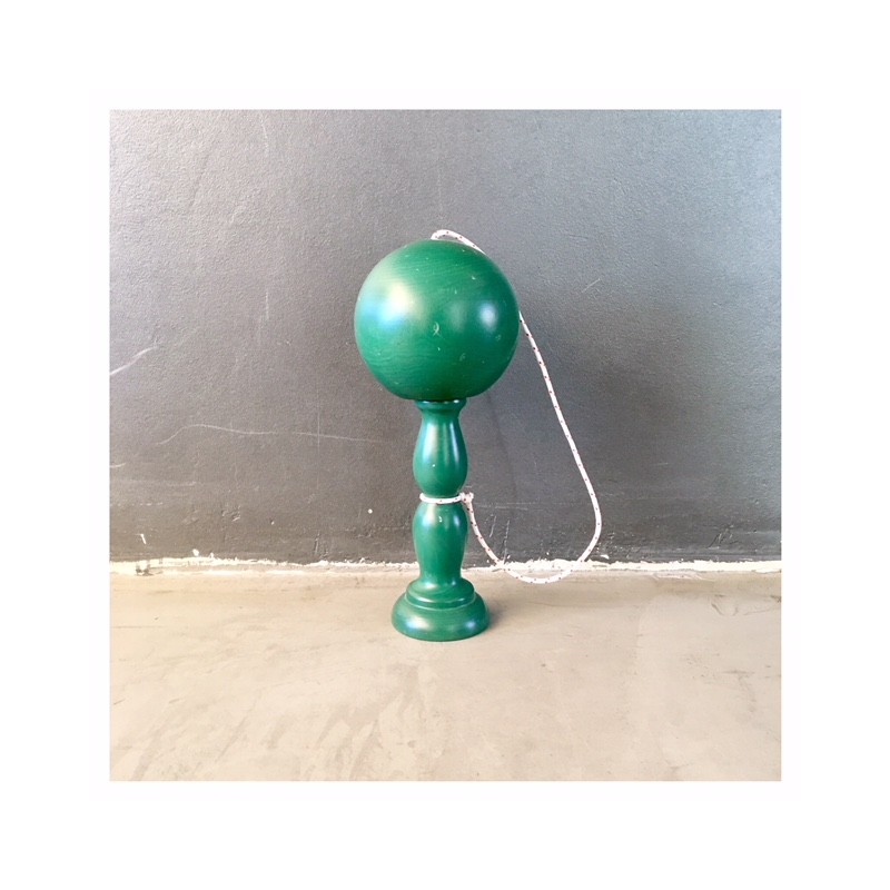 Bilboquet géant vert avec sa cordelette blanche et rouge.