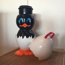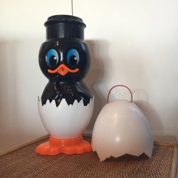 Caliméro en chair et plastique. Boite de 45 cm de haut pour y ranger ses trésors ou s’en servir de tirelire si on ouvre la fente qui est sur le dessus de la coquille.
