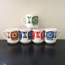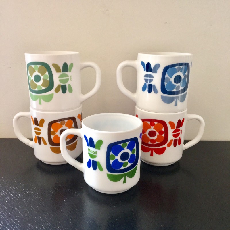 Thé ou café ? Bah chocolat !Y en a pour tous les goûts avec ces 5 Mug Mobil aux jolies couleurs Vintage. Mug en arcopal des années 70, cadeau aux clients des stations-essence Mobil.