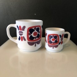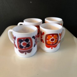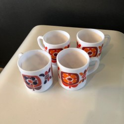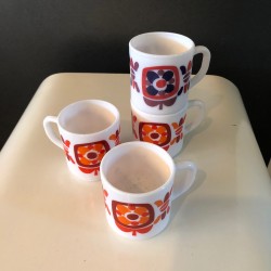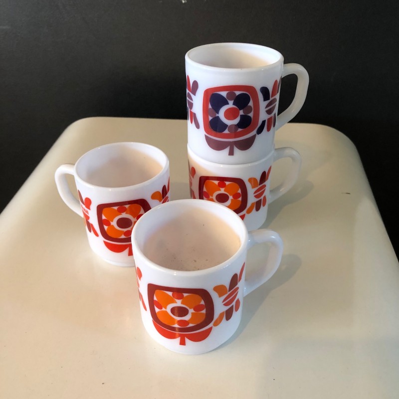 4 tasses à café Mobil aux jolies couleurs Vintage. Tasses en arcopal des années 70, cadeau aux clients des stations-essence Mobil.