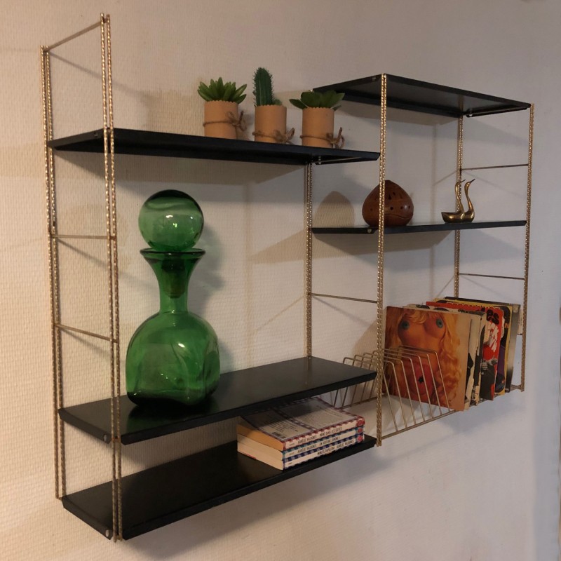5 plateaux métalliques noir patinés par le temps, une étagère corbeille pour les vinyls ou les livres et 3 échelles en métal torsadé doré. Dans la lignée des étagères String, Tomado...