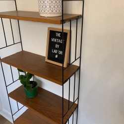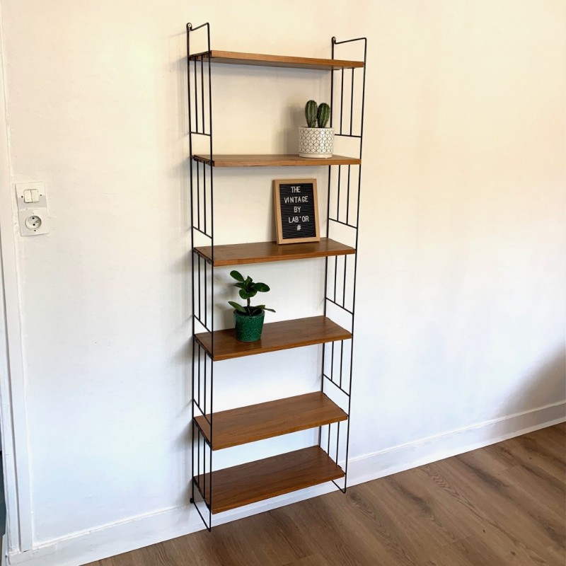 2 montants noirs très graphiques avec 6 étagères en bois couleur miel.