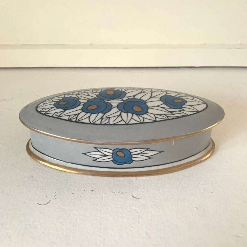 Boite en porcelaine ovale aux motifs art déco. Pour y ranger tous vos secrets ou juste en déco.