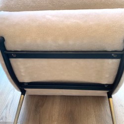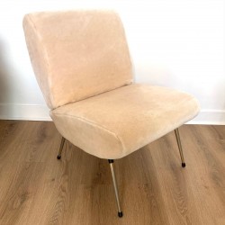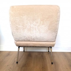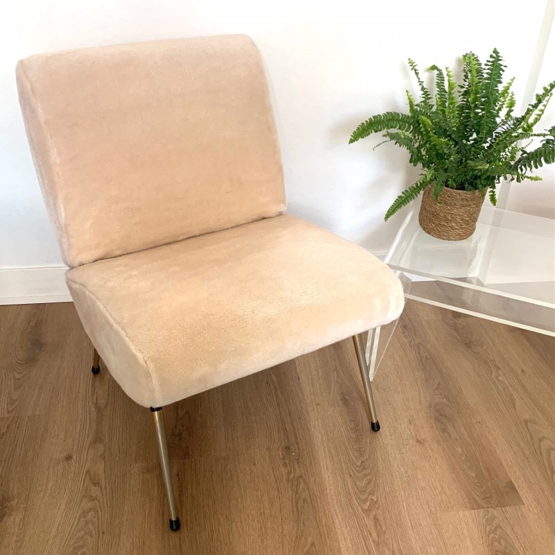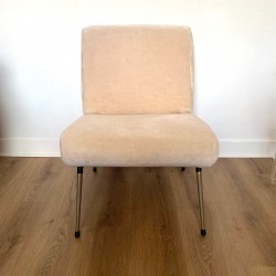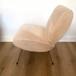 Un amour de fauteuil ! Attribué à Pelfran ce joli petit fauteuil en fausse fourrure beige rosé ira parfaitement dans tous les petits coins de la maison. Piétement fuselé en métal.