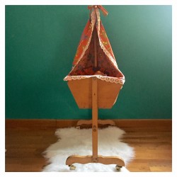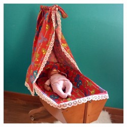 Joli berceau de poupée vintage avec roulettes, parure et ciel de lit pour faire comme les grands ! Imprimé d'origine rouge avec chat et souris, agrémenté d'une belle dentelle d'époque.