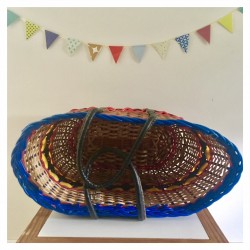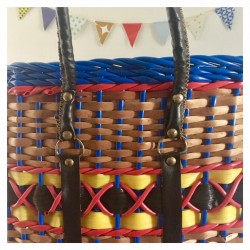 Et si on se la jouait Vintage partout dans la rue ?!?... facile avec ce cabas typique des années 60 en fibre de rotin et scoubidou bleu, rouge, noir et plastique jaune. Les deux anses sont en cuir. Le rotin et le scoubidou sont en bon état. Dimensions : 41 x 21 x 29 cm (45 cm de haut avec les anses).
